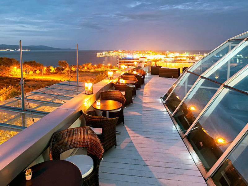 Vybavení 7patrový, moderní hotel má vstupní halu, výtahy, asi 128 pokojů, Wi-Fi ve veřejných prostorách (včetně), restaurace, denní bar a sky bar (za poplatek) s výhledem na starý Nessebar. Střešní bazén s panoramatickou střešní terasou a bar u bazénu vás zve k relaxaci a opalování. Lehátka, podložky a osušky jsou u bazénu včetně.