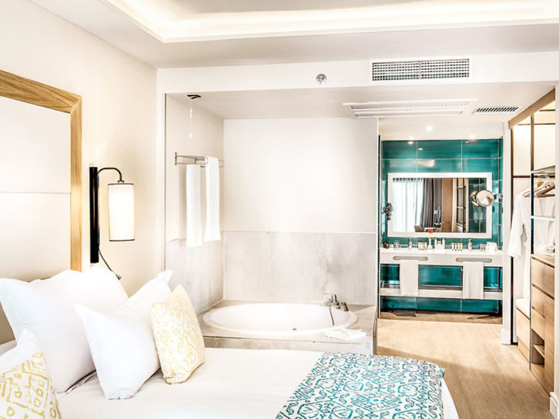 Ubytování: Dvoulůžkový pokoj (A2-3E) s kombinovanou obývací pokoj / ložnice, minibarem (naplnění za poplatek), klimatizací, trezorem, satelitní TV, telefonem, koupelnou s vanou a sprchovým koutem s masážními tryskami, WC, vysoušečem vlasů a balkonem nebo terasou s bazénem - nebo výhled do zahrady. Dvoulůžkový pokoj s bočním výhledem na moře (A1-3A) a s výhledem na moře (A2-3C) k dispozici. Deluxe junior suites (A2-3F) o rozloze asi 85 metrů čtverečních mají velkou obývací / spací prostor, jacuzzi v koupelně a balkon. Apartmá typu Deluxe Junior (A2-3H) nabízejí také částečný výhled na moře, jinak A2F.