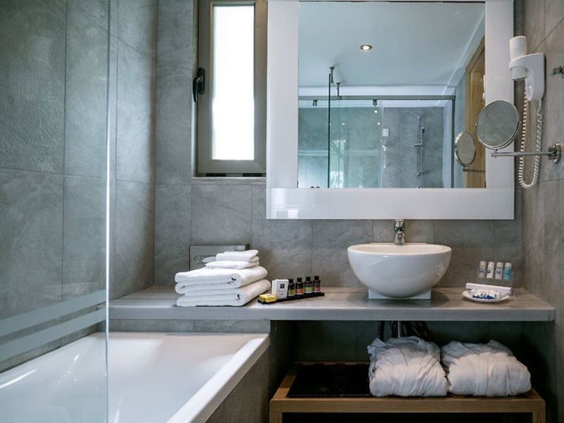 Vybavení: 261-pokojový hotel nabízí výtah, business centrum a Wi-Fi (včetně), klimatizované restaurace, bar a obchody. V dobře udržované zahradě je bazén s mořskou vodou se sluneční terasou, stejně jako útulná taverna, a la carte restaurace "Asterias", bar a a la carte brasserie na pláži (počasí dovolí, a-la-carte restaurace jsou otevřené) od konce května do začátku října). Plážové židle, deštníky a plážové ručníky jsou součástí bazénu a na pláži.