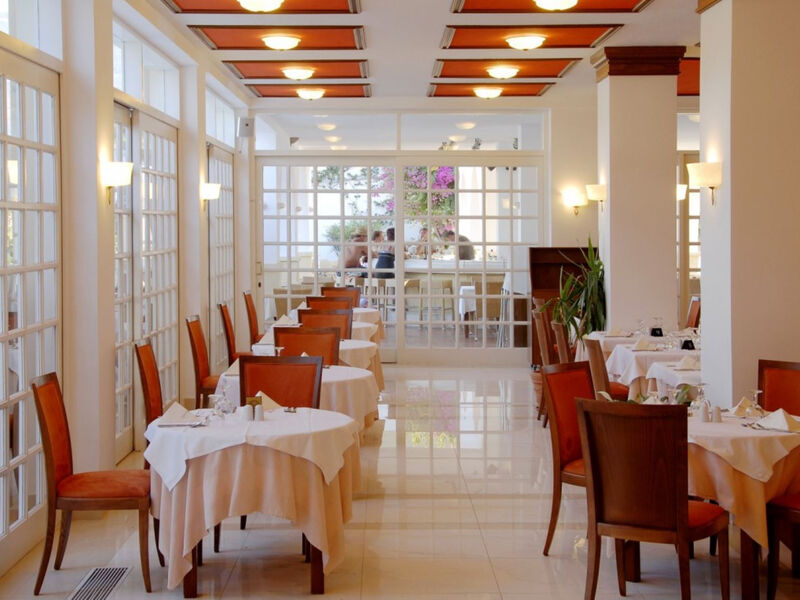 Restaurační zařízeníhlavní restaurace: druhy kuchyně: řecká, mezinárodní, bezlepková jídla: v ceně, na vyžádání, vegetariánská jídla: na vyžádání, formou bufetu, show cooking, květen - říjen, denně 07:30 - 10:15, denně 18:45 - 21:15, s terasou, vysokými židlemi pro děti, vhodné oblečení