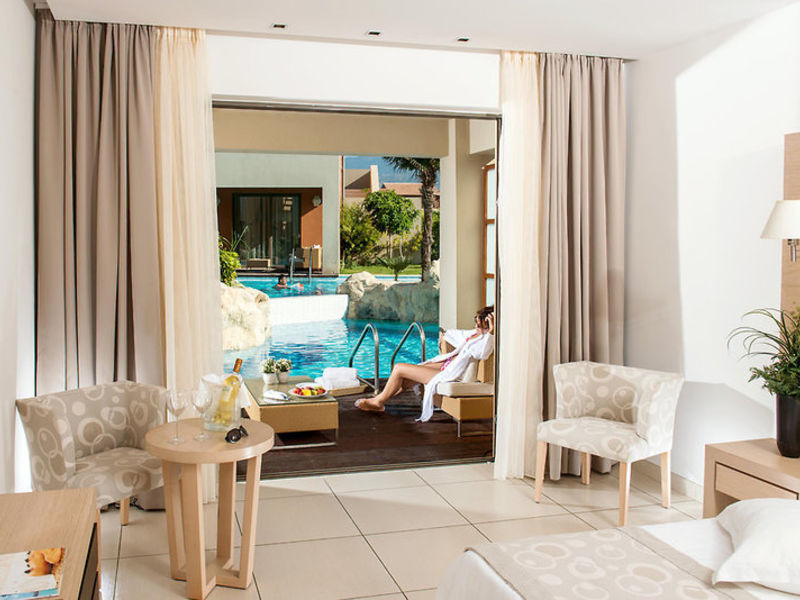 Ubytování: Elegantně zařízené dvoulůžkové pokoje (A1-3A) s dlažbou, čaj a kávovarem, minibar, klimatizace, trezor, satelitní TV, WLAN (v ceně), telefon, koupelna s vanou a integrovanou sprchou, WC a balkon nebo terasa s výhledem do zahrady nebo pool. Případně také s výhledem na moře (A2-3B), se sdíleným bazénem (A2-3E) a terasou nebo jako úsporný pokoj (A2-3S) rezervovatelné. Rodinné pokoje (A2-3C) mají oddělenou ložnici a vstupní část s rozkládací pohovkou, jinak vybavené jako A2A. Executive Family Suites (A2-3F) mají oddělenou ložnici a obývací / spací část s 2 rozkládacími lůžky, jinak A2A. Executive Suites (A2-3L) jsou prostornější a mají vlastní bazén s bočním výhledem na moře. Executive Suites (A3-4H) mají 2 oddělené ložnice, obývací pokoj, 2 koupelny s vanou a sprchou a společným bazénem s vyhrazenými lehátky a slunečníky, bočním bazénem nebo výhledem na moře a balkonem nebo terasou, jinak s vybavením, jako je A2A , Maisonette Sea Front (A3-4J) s 1 samostatnou ložnicí, 2 koupelnami s vanou a integrovanou sprchou, sdílející bazén a výhled na moře, jinak s vybavením, jako je A2F rezervovatelné.