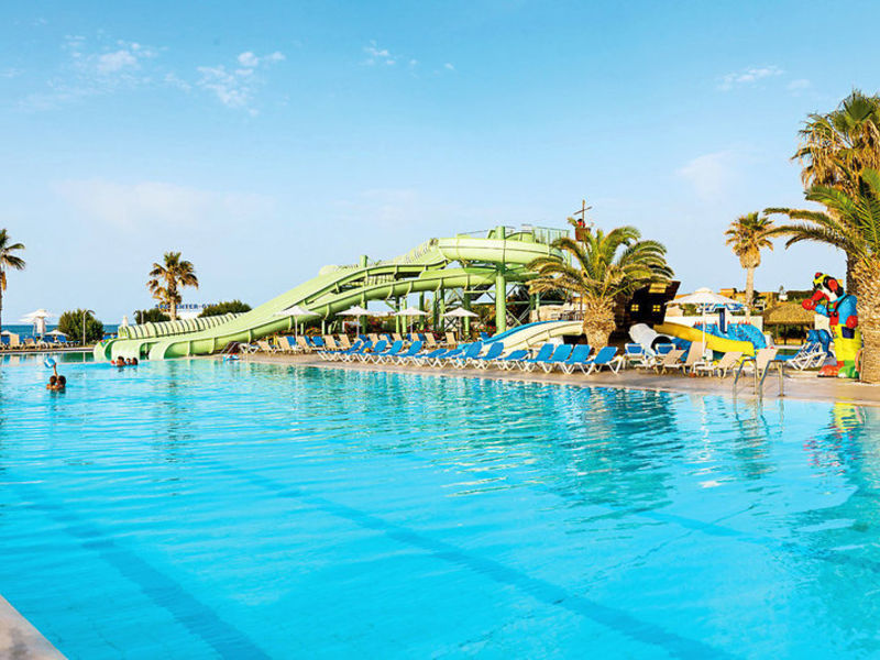Vybavení: Komplex má celkem 450 pokojů rozložených v budově hotelu a bungalovů. Recepce a posezení s Wi-Fi a internetovým koutkem (bufetová restaurace), hostinec "Kalypso" (oběd, večeře s rezervací), 3 bary a bufet "Thalassa" (WOK & BBQ) a mini market. V rozsáhlých zahradách se nachází 6 bazénů (sportovní bazén, relaxační bazén, dětský bazén s tobogány, bazén s tobogány od 8 let) a sluneční terasy. Plážové lehátka a slunečníky u bazénu a na pláži včetně.