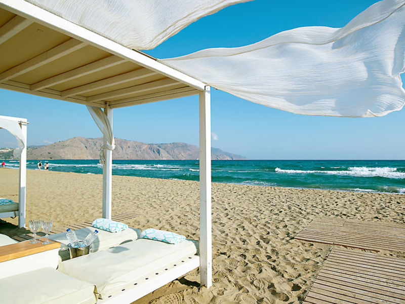 Poloha: Luxusní hotelový komplex v klidné lokalitě. Hotel je propojen soukromým podchodem s hotelovou vlastní jemnou písečnou, mírně svažitou pláží asi 100 m. Různé restaurace a bary, stejně jako nákupní a zábavní zařízení jsou vzdáleny asi 1,5 km. Doba transferu z letiště Chania je asi 50 až 90 minut, z letiště Heraklion asi 100 až 160 minut.