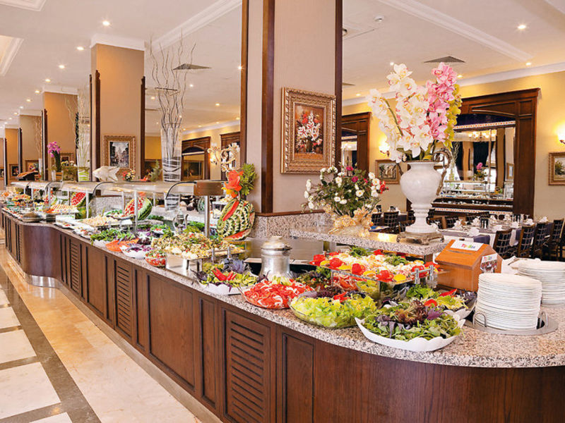 All Inclusive: Plná penze formou bufetu (strava formou bufetu), pozdní snídaně, občerstvení, káva / čaj / pečivo, ovoce, 2 a la carte restaurace (rybí speciality, čínská a italská kuchyně / sezóna / s Voranm./1x za pobyt). Nealkoholické nápoje, místní, některé importované alkoholické nápoje (10,00-24,00 hod). Minibar je naplněn při příjezdu, 1x láhev vína a minerální vody denně 1l. Nealkoholické nápoje, snacky, nealkoholické nápoje vAqua Park (pondělí až pátek).