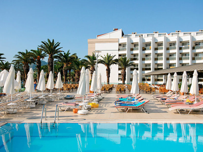 Poloha: Na pláži na pěší promenádě. přibližně 3 km od města Marmaris. Minibus spoje. Transfer z letiště Dalaman asi 90 až 160 minut.