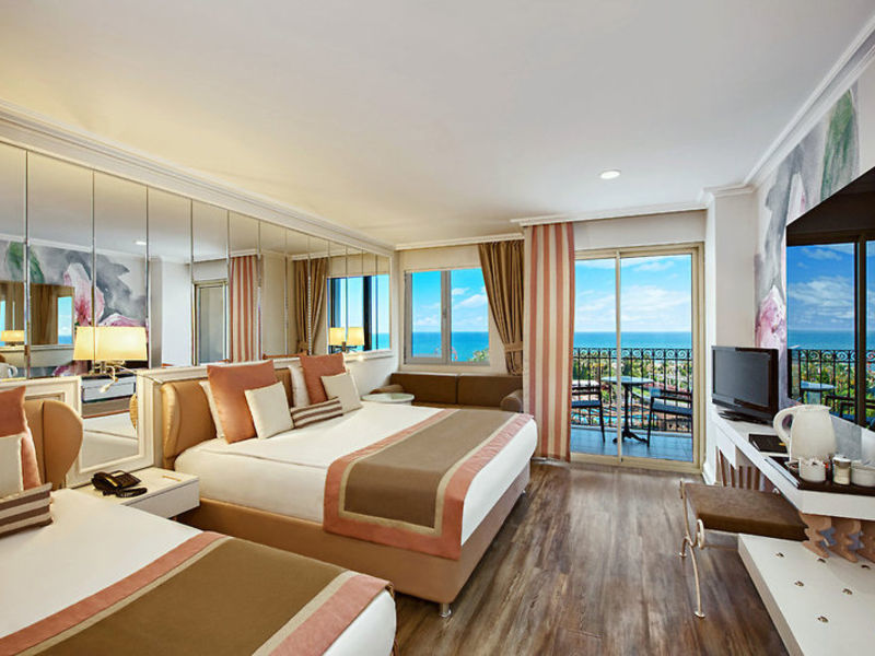 All Inclusive: Snídaně, pozdní snídaně stoupačky, nedělní brunch s šumivým vínem, oběd a večeře formou bufetu, občerstvení, odpolední kávu, čaj a koláče, půlnoční snack, zmrzlina (7.4.-31.10./stundenweise). Večeře buď celý rok ostatní 5 à v à la carte restaurace a 2 restaurace la carte 7.4. -31.10. (turecké, italské, mexické, Dálného východu, japonská kuchyně, sushi a krevety / s událostí / 1 x za pobyt).Bazén, místní a některé dovážené alkoholické nápoje 24 hodin při každé otevřené bary. Čerstvě vymačkané ovocné šťávy v Kehri baru 10.00 18:00 (7.4. -31.10.) Sektem na příjezdu. Minibar je denně s vodou, Erfrischungsgetranken a pivo výstižný. Pokojová služba 24.00-6.00.