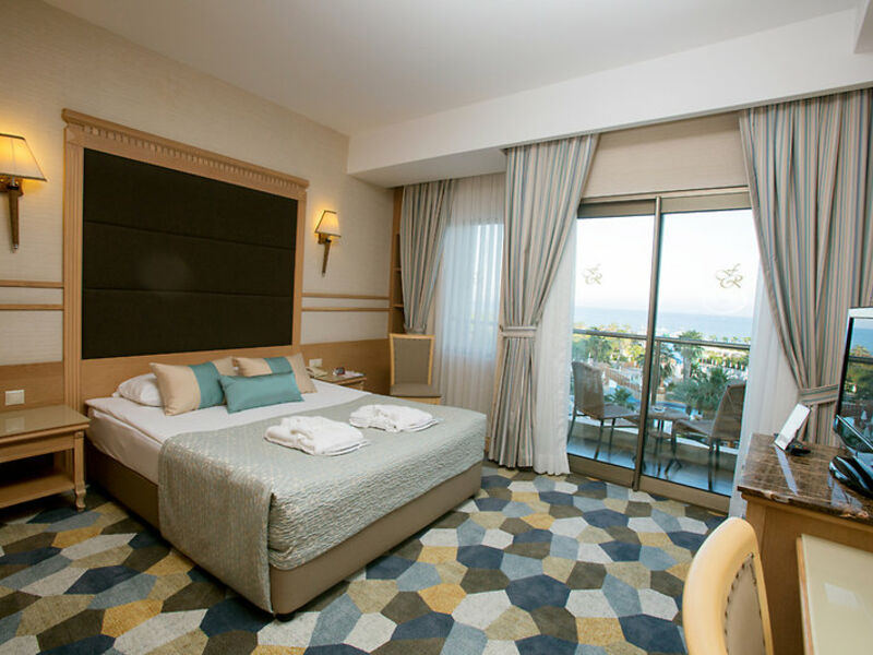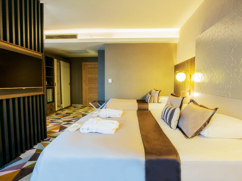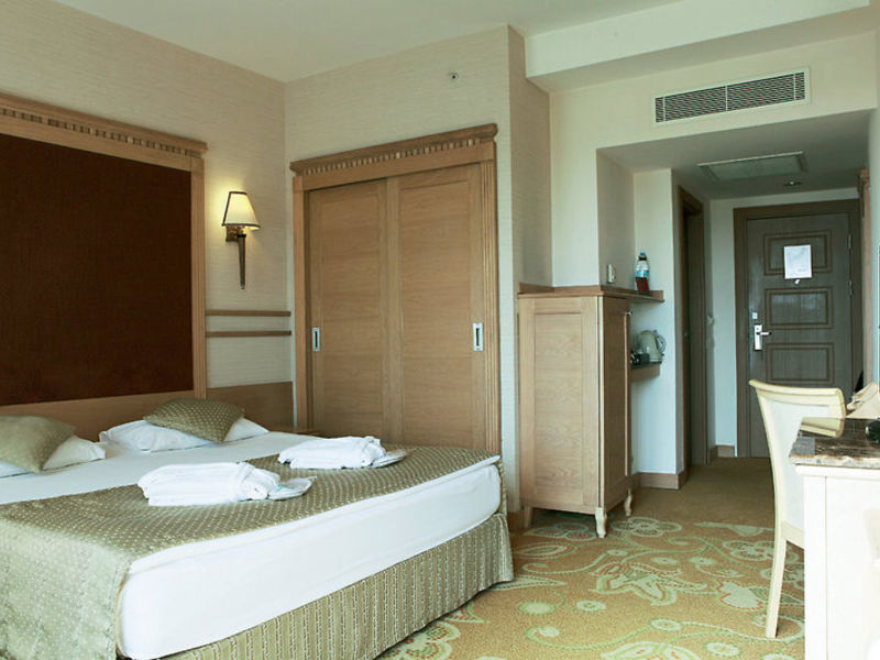 All Inclusive: snídaně, oběd a večeře formou bufetu, poloprázdné občerstvení, odpolední káva / čaj a pečivo, 3 à la carte restaurace (turecká, čínská a italská kuchyně / s předstihem / 1 x na osobu týdně). Vybrané nealkoholické nápoje a místní alkoholické nápoje od 10:00 do 24:00. Minibar je denně plněn balenou vodou a nealkoholickými nápoji.