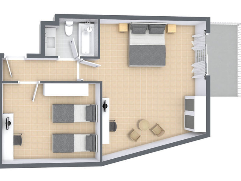 FAMILY ROOM: (A2-4C) Přibl. 50 m², standardní pokoj, vana s vířivou vanou, dvě ložnice s dvěma samostatnými lůžky a pohovkou, spojovací dveře, boční pohled na moře.