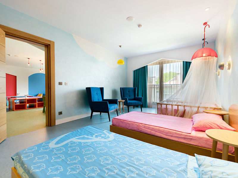 Rodiny: dětské posezení (na vyžádání, za poplatek), mini klub (4-12 let), dětská postýlka, kočár, dětský monitor, vysoká židle.