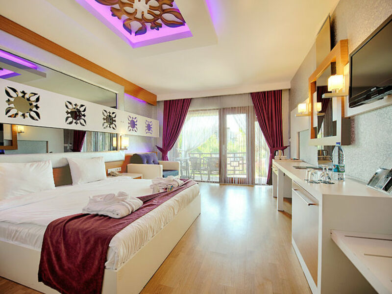 Ubytování: Dvoulůžkový pokoj (A1-3A): V bungalovu budovách. přibližně 26 m², laminátové podlahy, klimatizace (individuální), trezor, telefon, satelitní LCD TV s hudebním kanálem, WLAN (v ceně), minibar (na vyžádání / splatné), koupelna se sprchou, WC, veřejným prostorem. Volitelně s omezeným bočním výhledem na moře (A2-3B) nebo bezbariérovým (B2A), 39m² s balkonem. Ekonomický pokoj (A2S) koupelna s vanou nebo sprchou, balkon, jinak A2A. Pokoj typu Deluxe (A2C): 25 m2, v horním patře dvojpodlažní budovy, s manželskou postelí, koupelnou s vanou nebo sprchou, varnou konvicí s kávou / čajovou soupravou, mramorovou dlažbou, balkonem, výhledem na moře, jinak A2A. Volitelně s terasou (A2G). Romantický pokoj (A2D): Přibl. 35 m2, v bungalovech. Laminátová podlaha, vířivka a sprcha na terase, výhled na moře, jinak A2A. Suites (A2-3E): Přibl. 50 m2, obývací pokoj, ložnice s manželskou postelí, 2 satelitní LCD TV, jinak A2D. Pokoj Cabana (A2F): V přízemí dvoupodlažní budovy. Stejně jako A2C, koupel s vířivou vanou a sprchovým koutem. Vířivka na terase, výhled na moře.