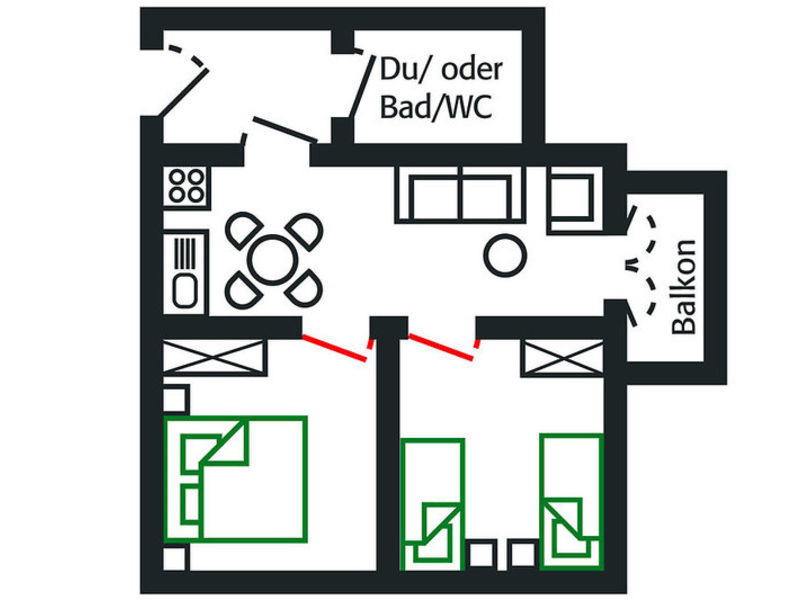 Apartmány Typ A1: C2A) 1 ložnice a 1 obývací pokoj se spojovacími dveřmi, obývací prostor, kuchyňský kout, jinak dvoulůžkový pokoj. (Apartmány typu A2 (D3A) 2 ložnice a 1 obývací pokoj s Verbindgstür, jinak jako typ A1.