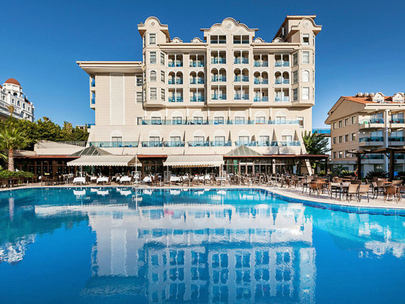 Vybavení Tento hotel má 334 pokojů rozloží na 3 budovy s 5 pater, výtahy. Další vybavení patří vstupní hala s recepcí, TV koutek, Inernetecke (proti poplatek), WiFi (ve vestibulu v ceně), restaurace, 3 restaurace à la carte (rybí speciality, Turkic a italská kuchyně), bary a obchody. Venku jsou 2 bazény, relax bazén a pool bar. Lehátka, slunečníky, podložkya ručníky Pro jsou u bazénu a pláže jsou zahrnuty (nutná záloha). Plážový snack bar.